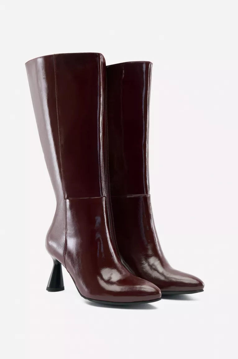 Сапоги из лакированной кожи с увеличенной шириной голенища, на устойчивом фигурном каблуке. Благодаря функциональной молнии изделие легко снимать и надевать. Голенище гарантирует плотную посадку по ноге любой полноты. Мысок острый. Стелька и подкладка из мягкого текстиля. Полнота увеличена.