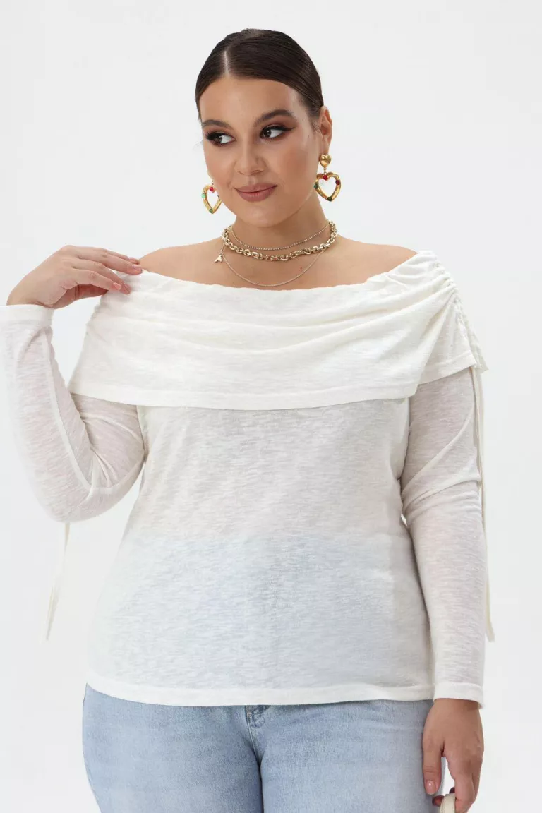 Лонгслив regular fit из смесовой вискоза, главная особенность которого универсальность, благодаря чему вещь в большинстве случаев не висит на теле как мешок, при этом сильно не прилегает. Длина до середины бедра, горловина с вырезом лодочка и открытыми плечами. Воротник с напуском, с боковой кулиской. Рукав длинный, пройма широкая.