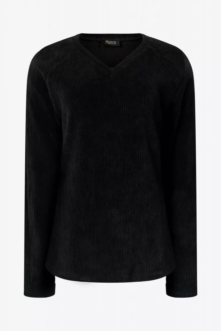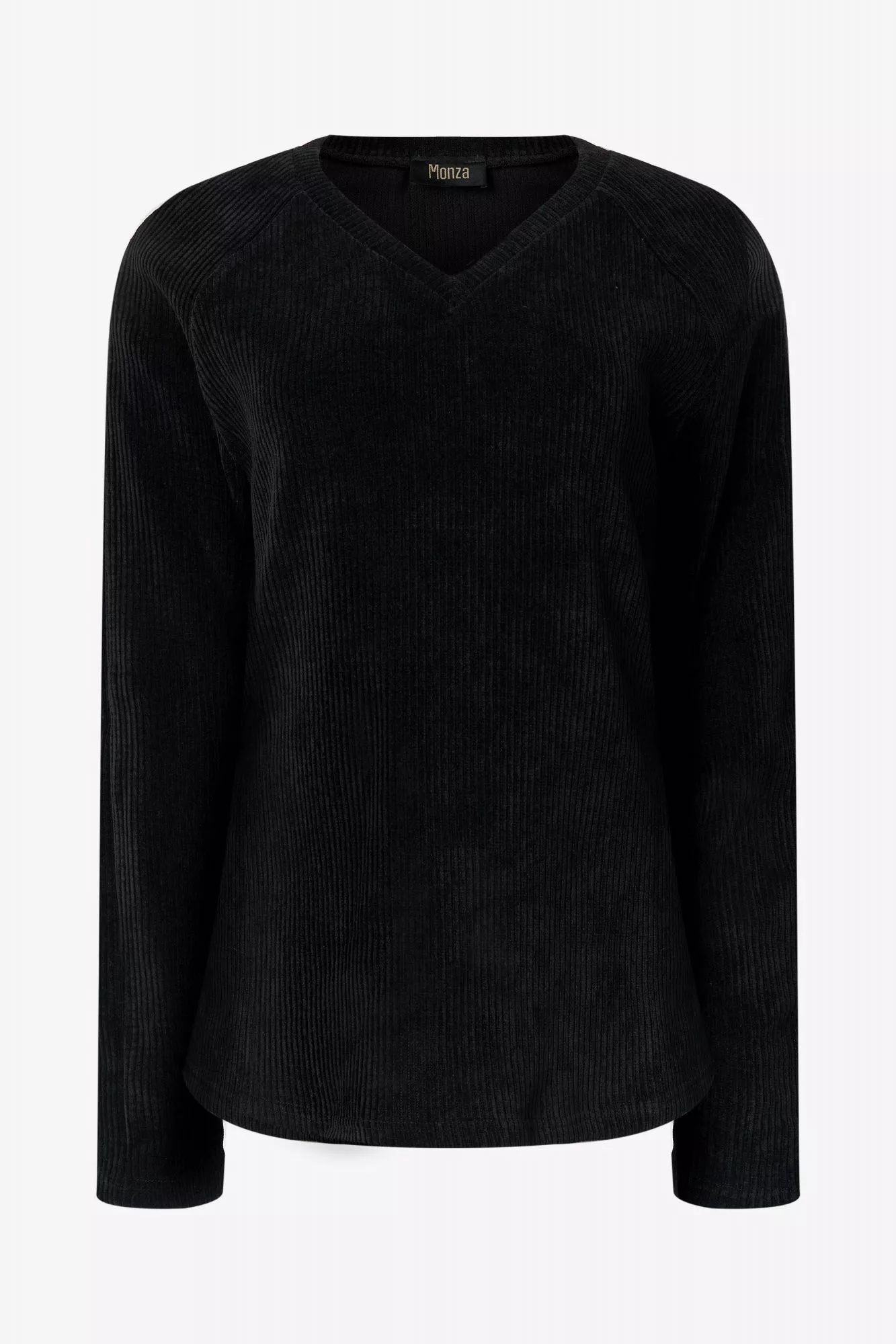 Лонгслив из трикотажного велюра в рубчик c с хорошей эластичностью. Рукав реглан, длинный, вырез V-образный.
