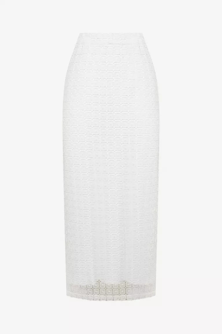 Юбка прямого силуэта из кружевной ткани, на подкладке штапель. Длина макси. Пояс на резинке. Сзади шлица.