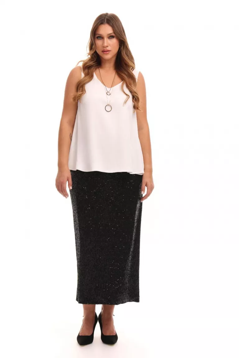 Юбка прямая, из поливискозы с пайетками, на подкладке. Длина макси. Пояс втачной-резинка. Сзади разрез.