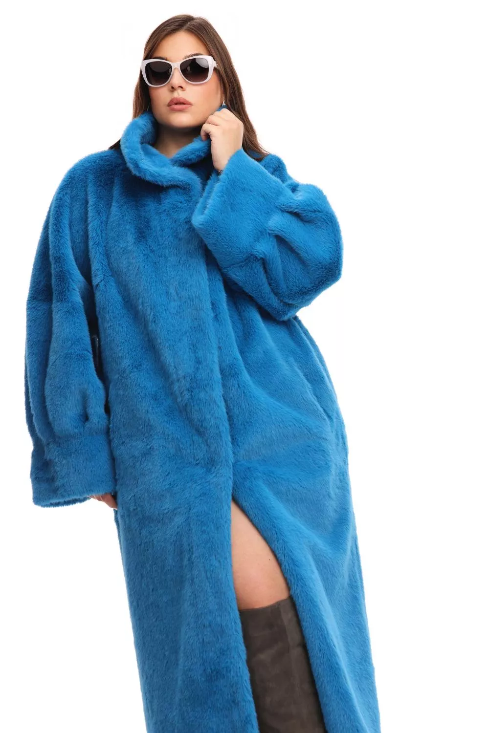 Меховое пальто из экомеха норки синего цвета на замшевой основе