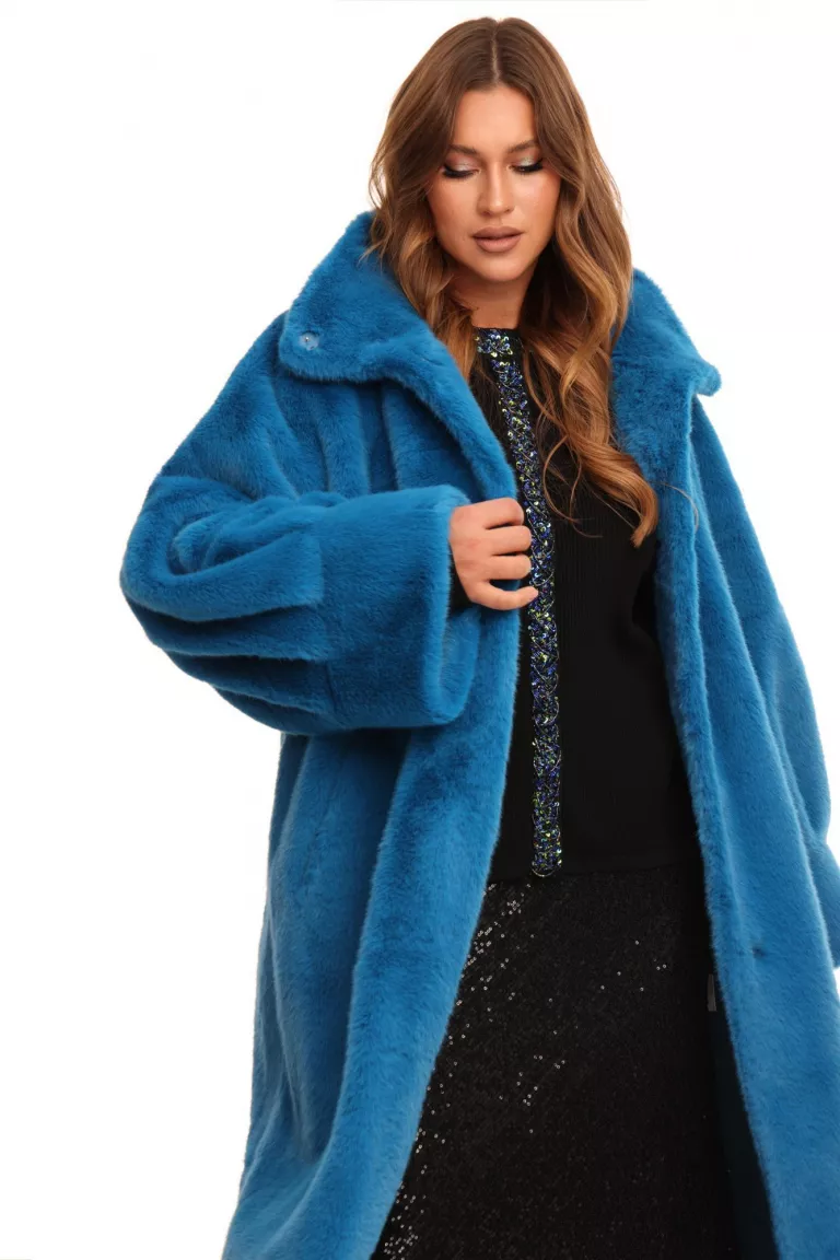 Меховое пальто из экомеха норки синего цвета на замшевой основе