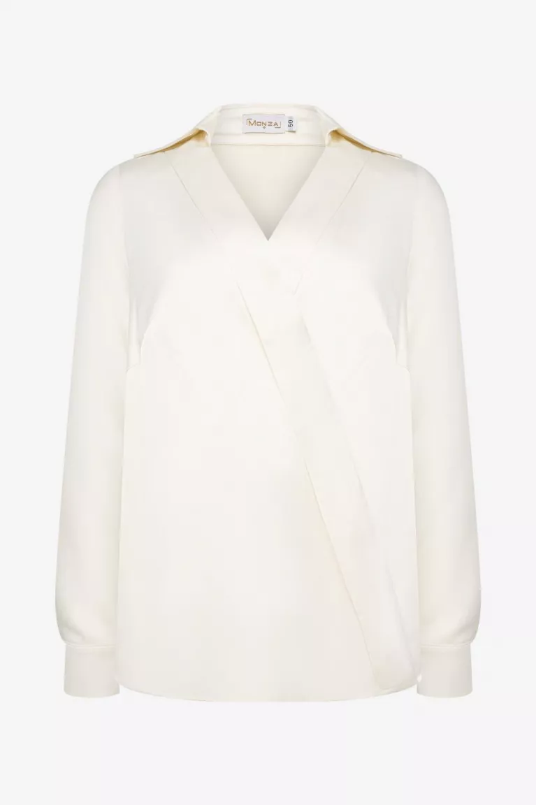 Блузка из смесовой вискозы с шелковой фактурой, без подкладки. Длина до середины бедра. Горловина "V"-образная, на стойке, с отложным воротником и встречной двойной планкой. Рукав длинный, на манжете,
