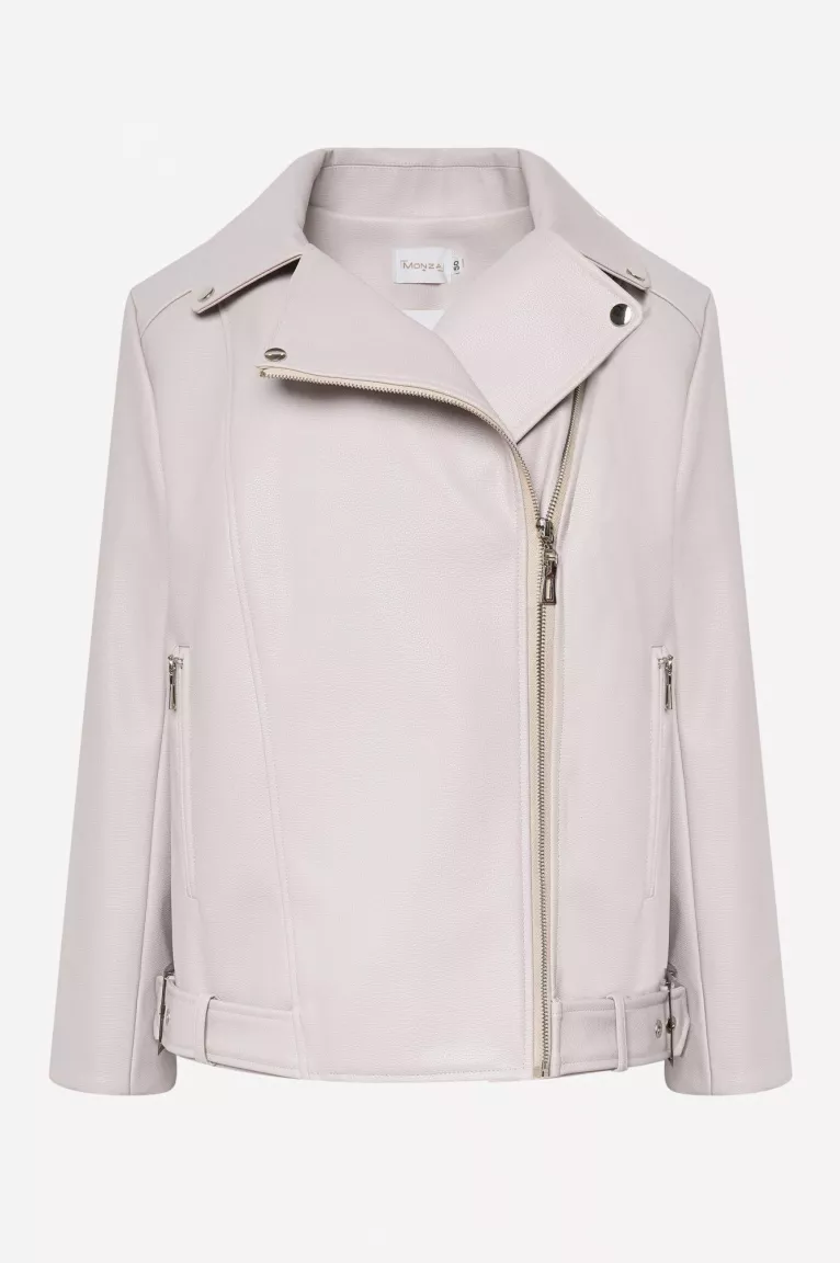 Куртка в байкерском стиле (косуха), из экокожи с тиснением, на подкладке. Длина до середины бедра. Воротник отложной. Рукав длинный, пройма глубокая. Спереди боковая застежка молния и внутренние карманы. На спинке рельефы. По бокам регулируемые ремешки.
