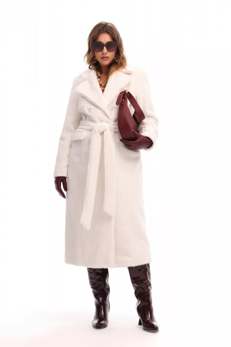 Белая двубортная шуба из экомеха с ворсом и поясом