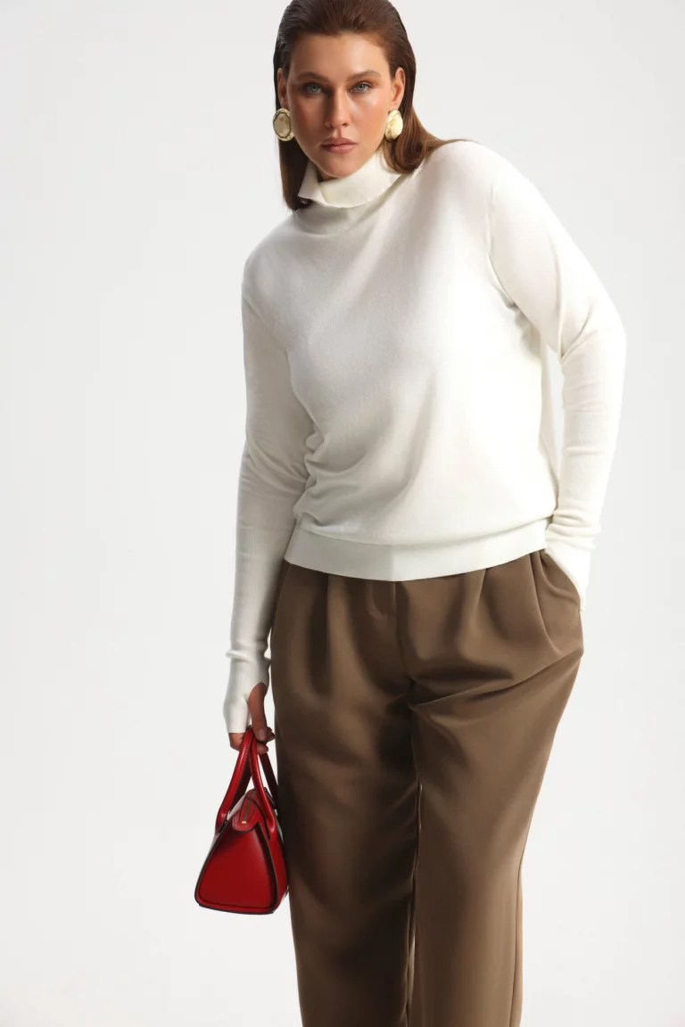 Водолазка бадлон оверсайз из смесовой вискозы. Длина до середины бедра. Горловина гольф с разрезом и вышивкой сзади. Рукав длинный, на длинной зауженной манжете с отверстием для пальца, пройма широкая.