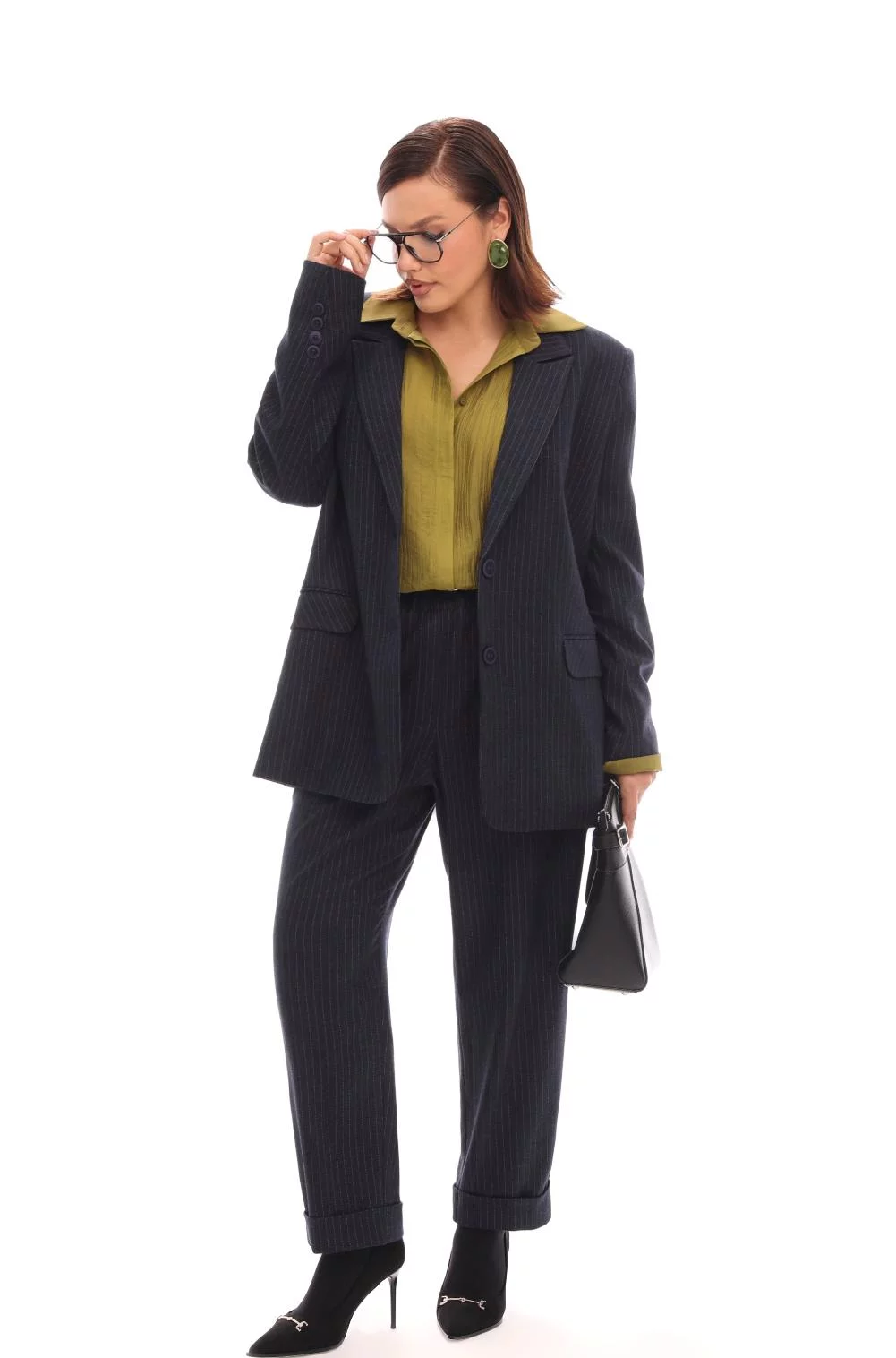 Однобортный жакет полуприлегающего силуэта, на подкладке и пуговицах, из легкой костюмной ткани. Длина миди. Воротник английский, с лацканами. На спинке рельефы, центральный шов и 2 шлицы. Спереди вертикальные вытачки и внутренние карманы. Рукав длинный, с выраженной линией плеча, пройма углубленная. В качестве застежки пуговицы.