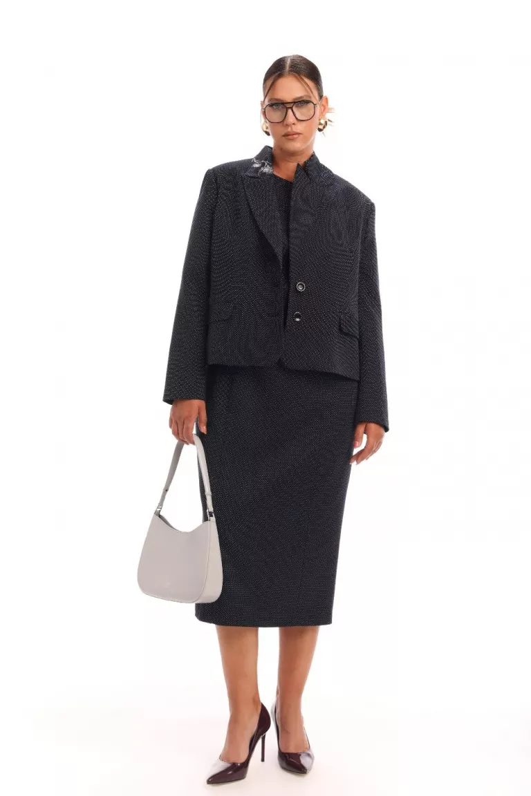 Однобортный жакет из легкой костюмной ткани с принтом, на подкладке. Длина жакета до середины бедра. Воротник английский. Спереди рельефы. Рукав длинный, с выраженной линией плеча и углубленной проймой, что придает жакету строгий и элегантный вид. Вышивка на рукавах.