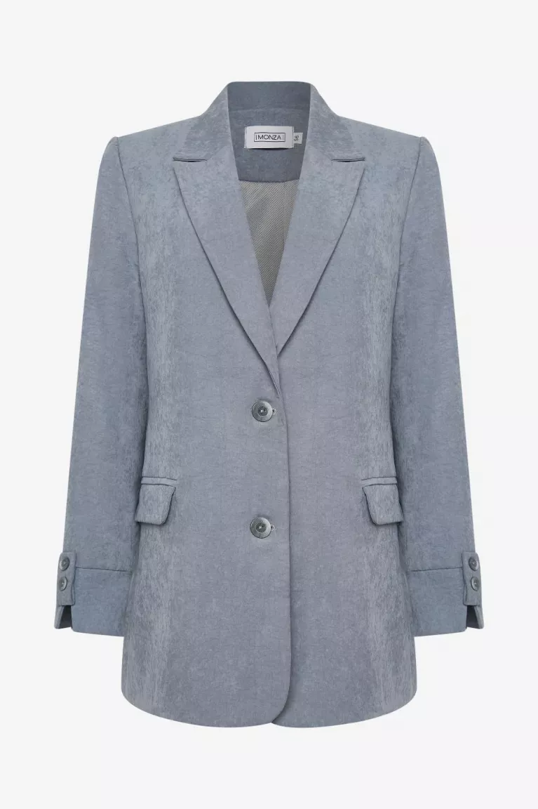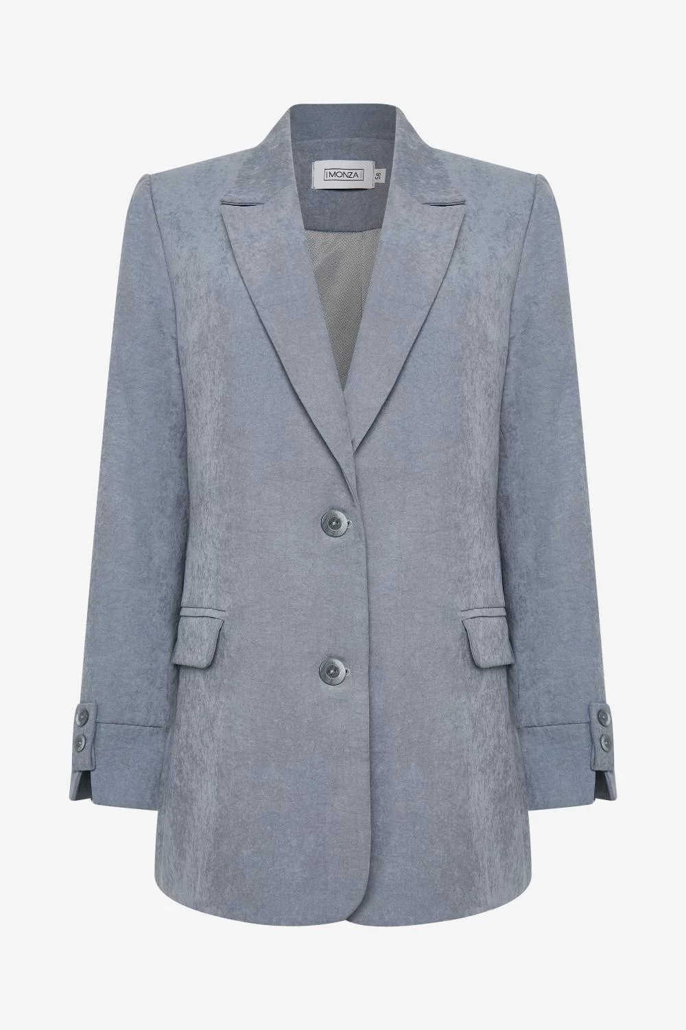 Однобортный жакет полуприлегающего силуэта, на подкладке и пуговицах из костюмной ткани с тач эффектом. Длина миди. Воротник английский, с лацканами. На спинке по талии декоративный вырез, с двумя шлицами на пуговицах. Спереди вертикальные вытачки и внутренние карманы. Рукав длинный, с выраженной линией плеча, разрез на манжете, пройма углубленная.
