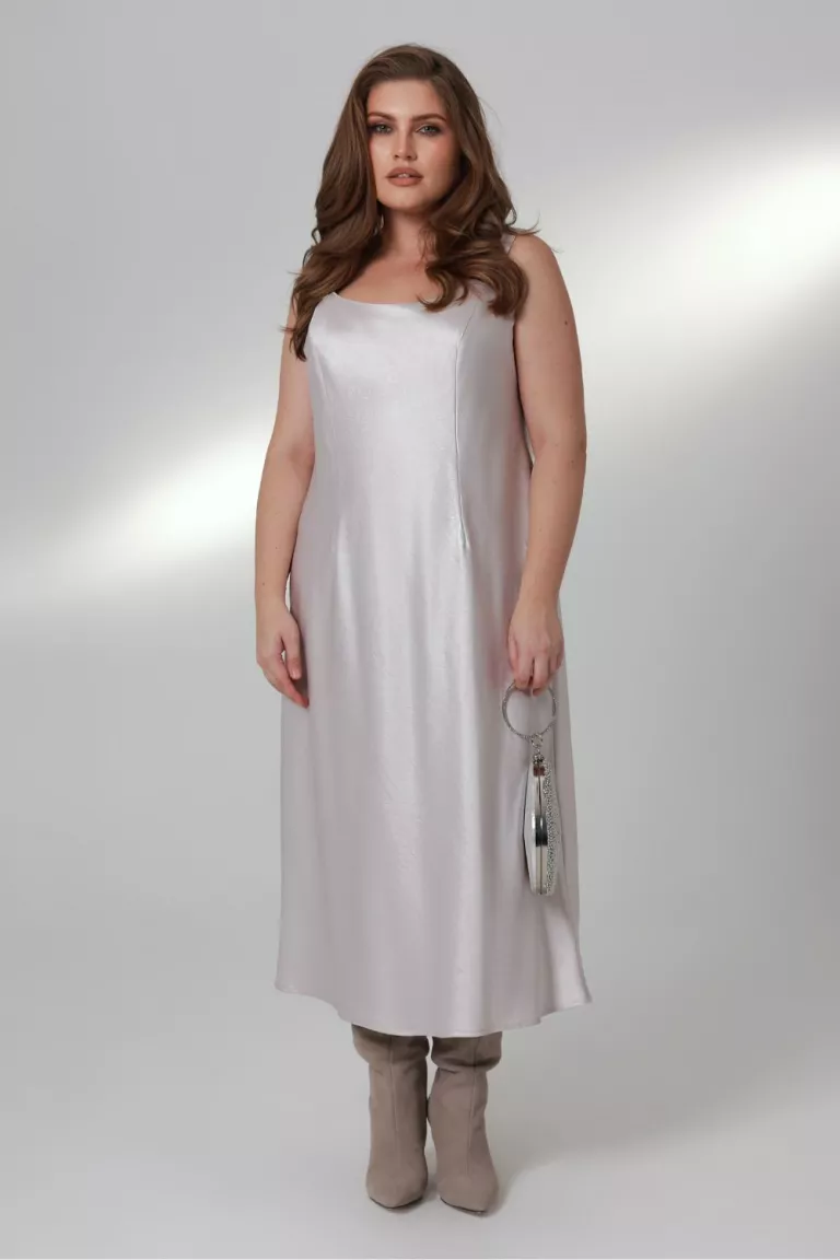 Платье-слип в стиле слинки приталенного силуэта на широких регулируемых лямках, скроенное по косой из смесовой вискозы. Спереди рельефы, на спинке центральный шов. Подкладки нет. Длина миди. Горловина "V"-образная. Пройма широкая.