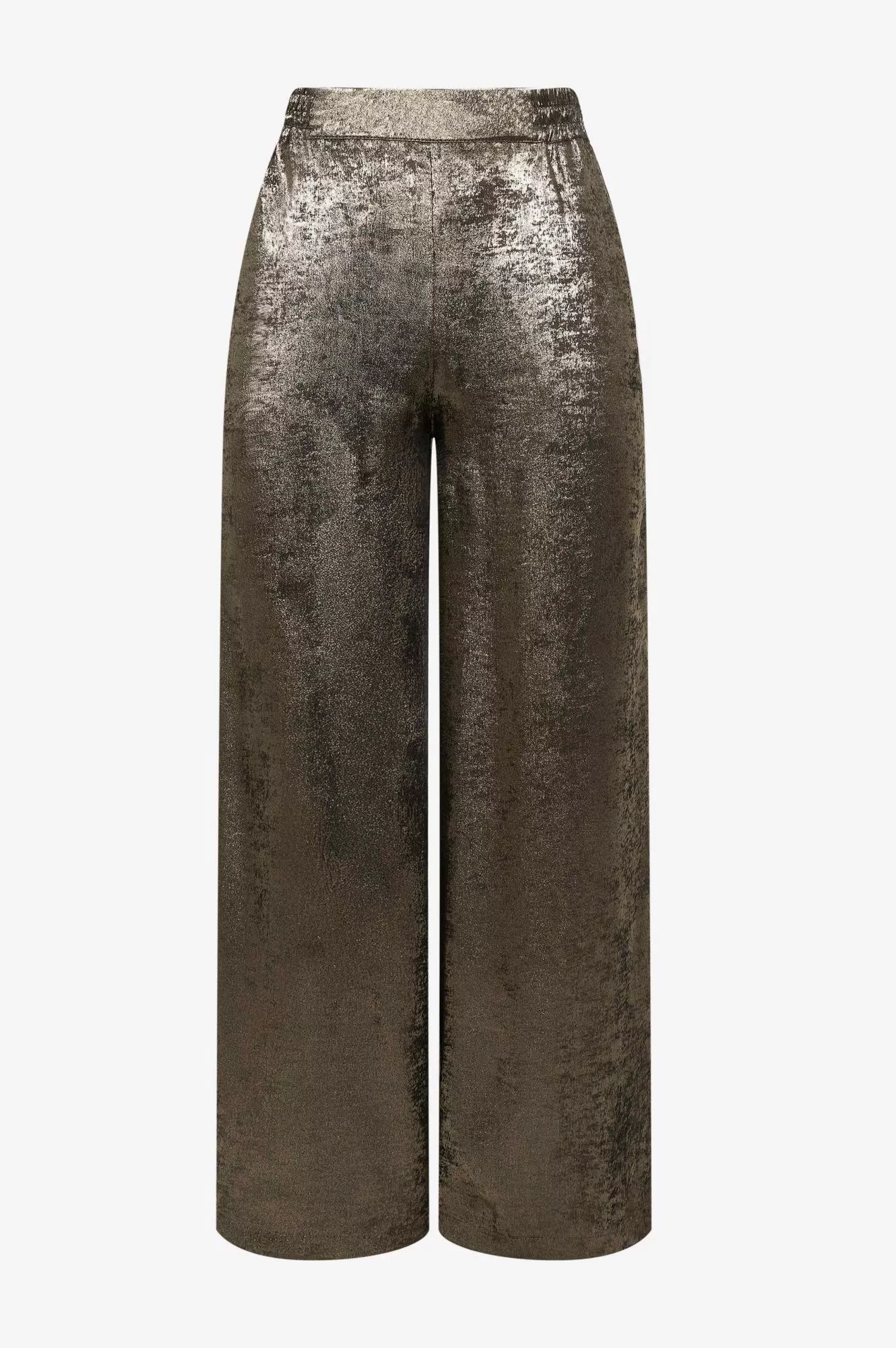 Брюки палаццо из смесовой вискозной ткани с шелковистой фактурой и фольгированным эффектом, длина макси. Пояс на резинке сзади. Карманы с отрезным бочком, посадка высокая.