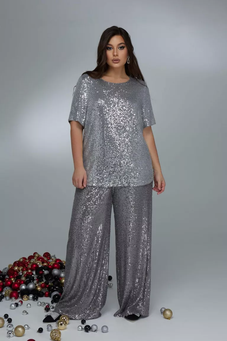 Серебристое палаццо прекрасно сочетается с тишотом из комплекта. Также к нему отлично подходит платье-жилет белого цвета. Дополнить образ можно стильными аксессуарами, например, серьгами. Для создания вечернего образа подойдут туфли на высоком каблуке и стильный клатч.