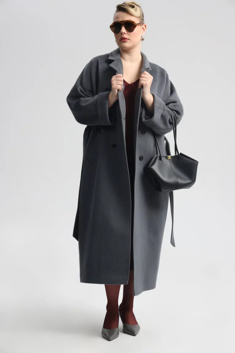 Пальто однобортное, базовое, из смесовой шерсти, на вискозной подкладке. Длина миди, на рост 172-178 см. Воротник отложной. Рукав реглан, длинный, пройма широкая, на конце разрез на пуговицах. Спереди застежка на пуговицы и прорезные карманы. Комплектуется поясом. Сзади шлица.