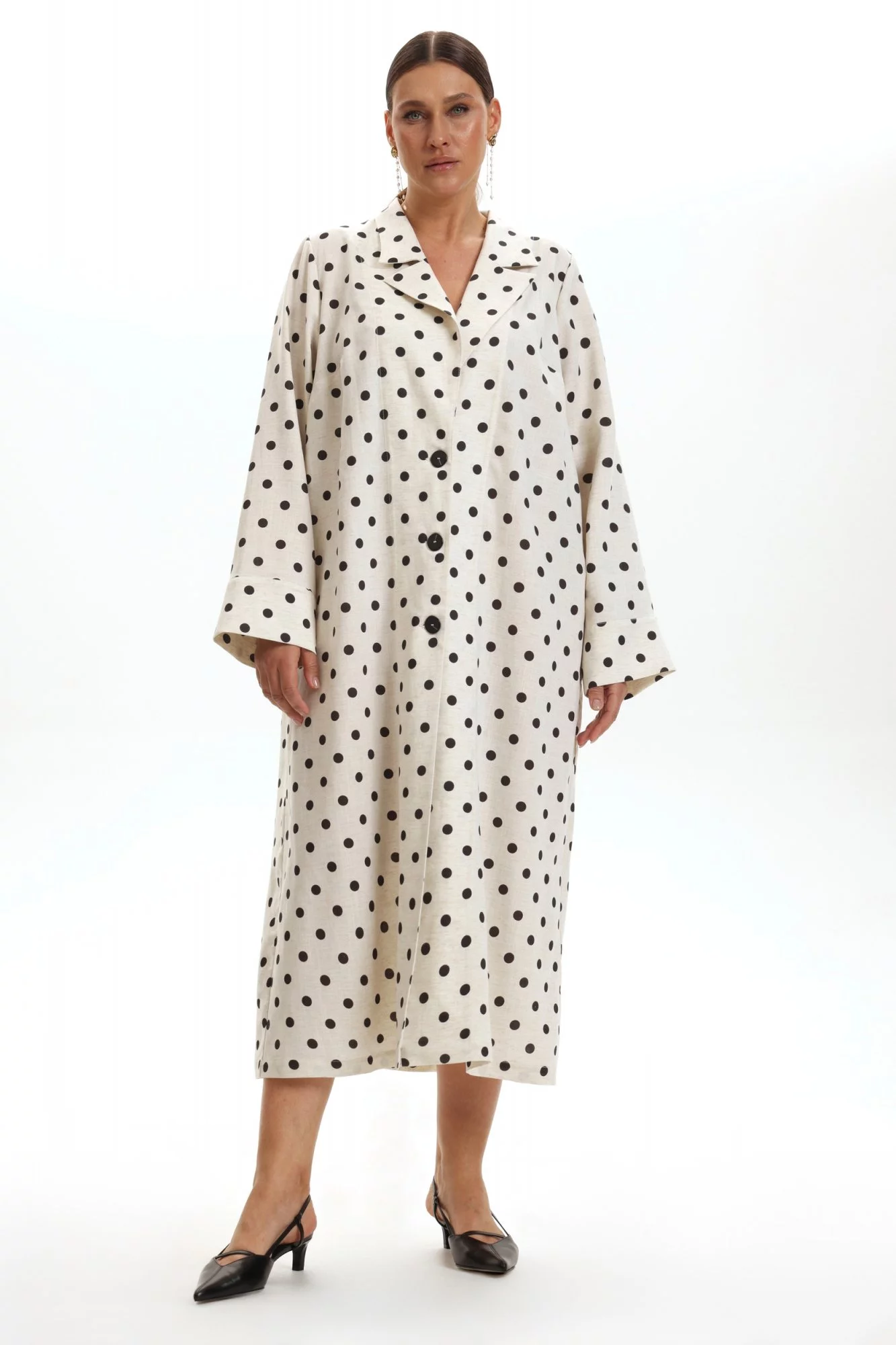 Летний плащ, накидка изо льна, с добавлением хлопка, с принтом горох, без подкладки. Плащ с английским воротником. Рукав длинный, на манжете с подворотом. Застежка пуговицы. Сзади шлица
