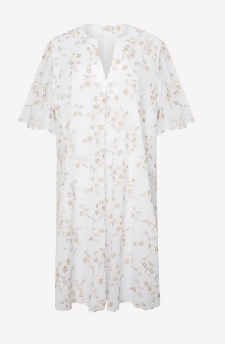 Платье А-силуэта, из хлопка шитье (английская вышивка) на подкладке. Длина миди. Воротник стойка, спереди V-образный вырез, отрезная кокетка и встречная складка. Рукав длинный, 3/4, пройма широкая.