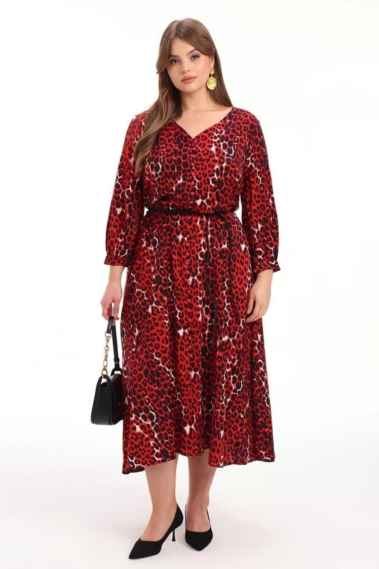 Платье миди с принтом. Изделие выполнено из нежного вискозного шелка без подкладки с ярким эффектным принтом. Отрезное по талии платье на внутренней резинке создает легкий, утонченный силуэт, а расклешенная юбка и боковые карманы добавят комфорта. Корректный V-образный вырез подчеркивает шею. Рукав фонарик 3/4 на манжете с углубленной проймой, внесет романтические нотки образу. Спереди застежка пуговицы.