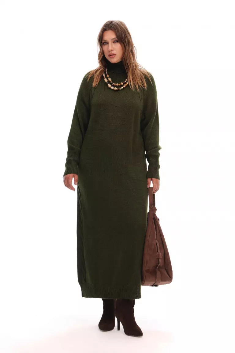 Платье-гольф прямого силуэта из смесового вязаного шерстяного трикотажа — идеальный выбор для холодной погоды. С длиной макси и элегантным воротником гольф, оно подчеркивает фигуру и визуально удлиняет рост. Платье не имеет застежек, рукав реглан, разрезы по бокам. Косая вязка сбоку придает модели дополнительную текстуру и оригинальность.