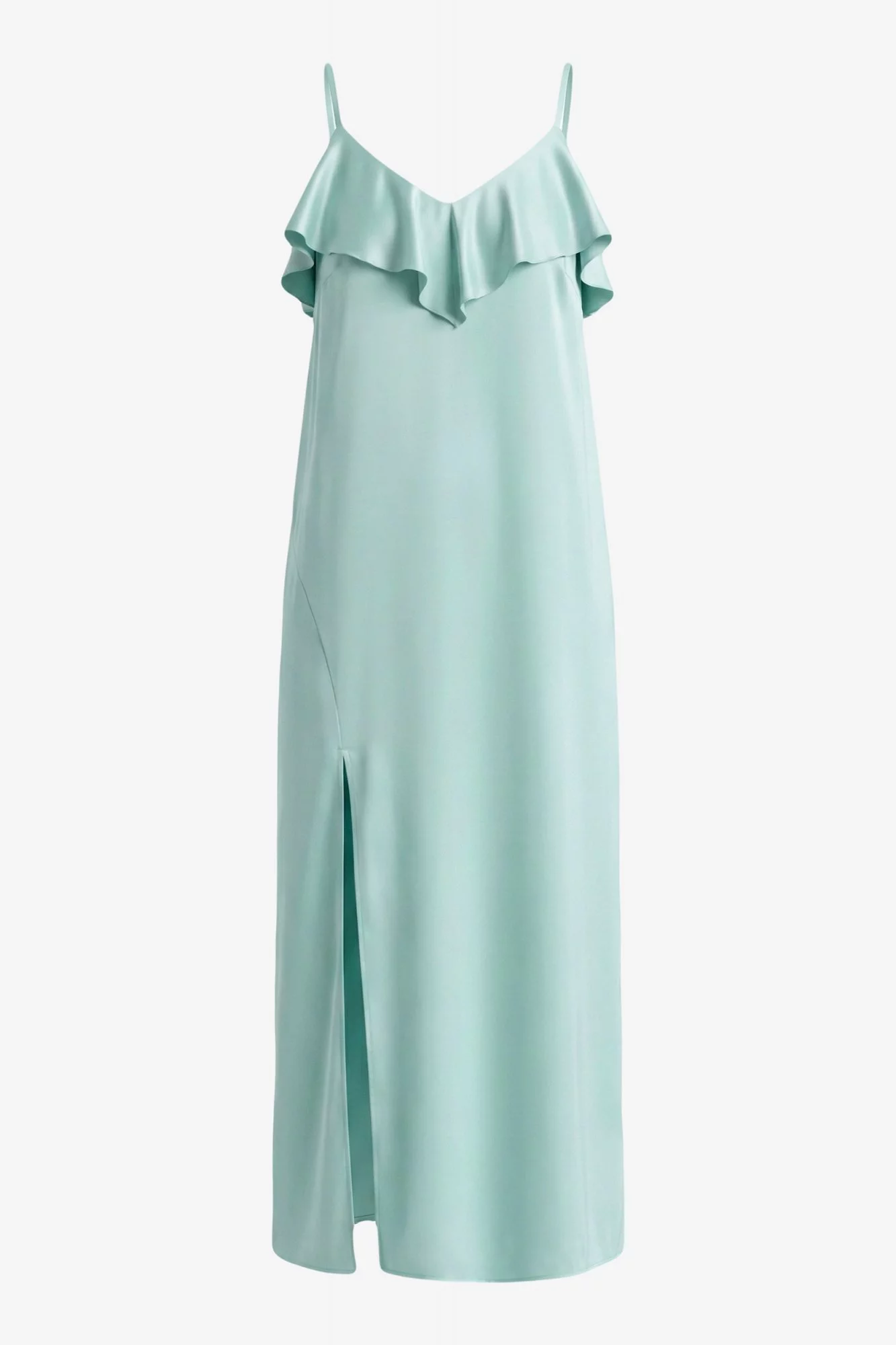 Платье-слип в стиле слинки А- силуэта на регулируемых лямках, из поливискозы. Подкладка в верхней части. Длина миди. Горловина "V"-образная с воланом. Пройма широкая. Сбоку разрез.