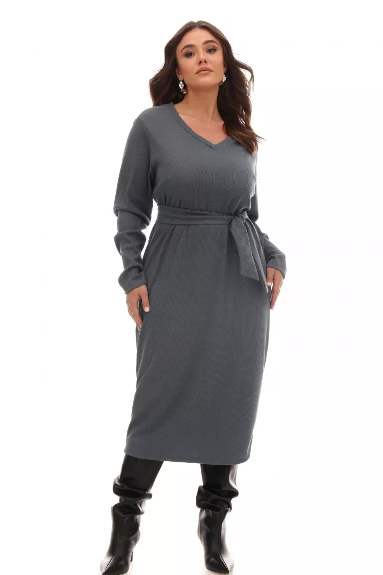 Платье-лапша из трикотажа с отличной эластичностью, которое идеально подходит для повседневного и спортивного стиля, выполнено в свободном силуэте и длине миди. Вырез "V"-образный, а на груди — вытачки, что придает изделию форму. Длинные рукава с широкой проймой добавляют удобства и стиля, а комплектный тканевый пояс позволяет регулировать посадку.