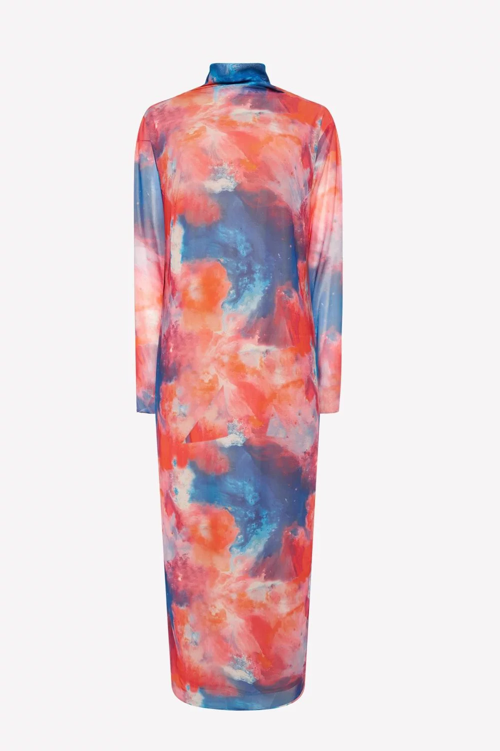 Описание: Платье футляр, с круглым вырезом и воротником гольф, длиной макси из ткани сетка на подкладке. Сзади разрез. Рукав длинный, пройма широкая. По низу и рукавам необработанные швы.