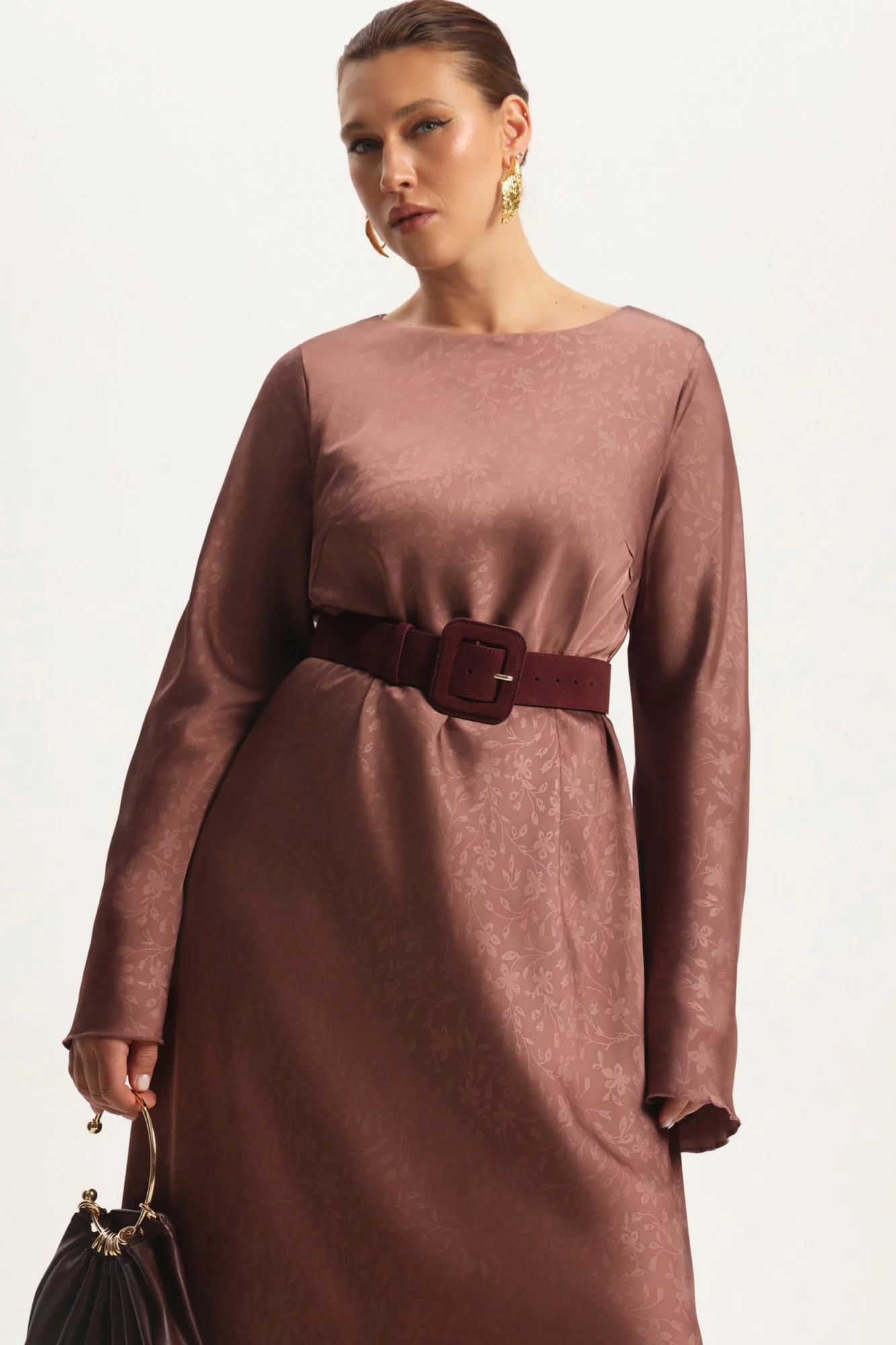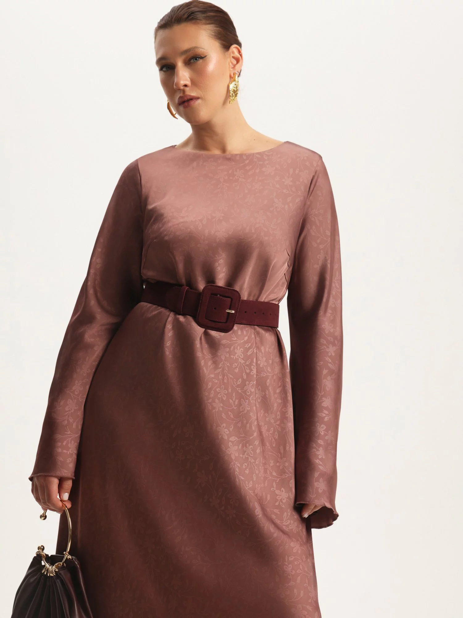 Платье полуприталенного силуэта с круглым вырезом, выполненное из поливискозного шелка, на подкладке. Длина макси, что придает ему элегантный и утонченный вид. Длинный рукав с расклешенной манжетой и широкая пройма создают воздушный и стильный образ. Ремень в комплект не входит.