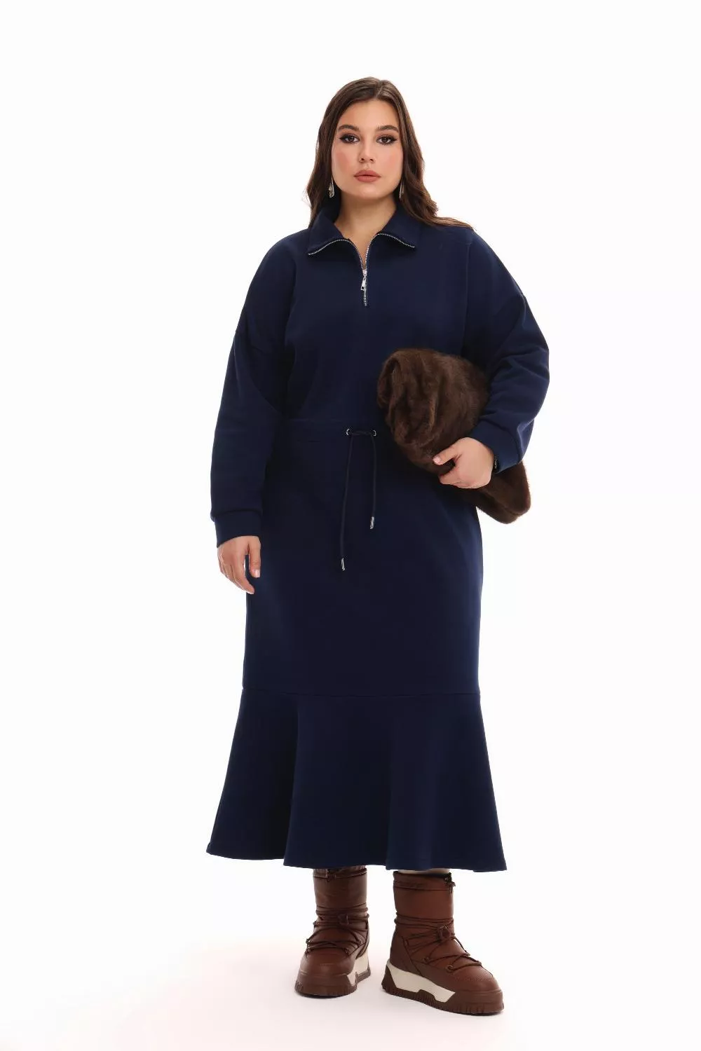 Платье худи из трикотажа пике, А- силуэта, с застежкой халф зип. Воротник стойка. Длина миди. По талии утяжка со шнурком. Рукав длинный, пройма широкая. По низу волан.