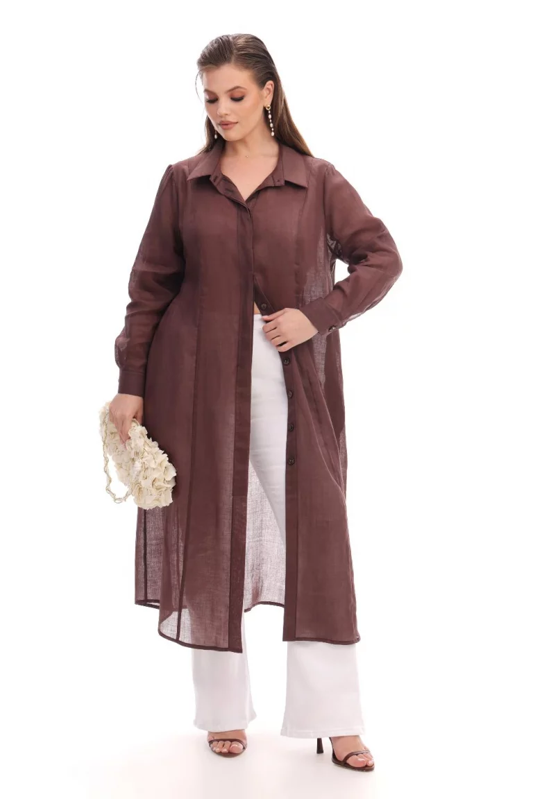 Платье-рубашка прямого силуэта, на пуговицах выполнено из рами (крапива), длина — миди, без подкладки. Воротник стояче-отложной, спереди — скрытая застежка на пуговицах. Рукав длинный, на манжете, пройма широкая. В боковых швах расположены карманы. Платье комплектуется поясом, который можно использовать для акцента на талии.