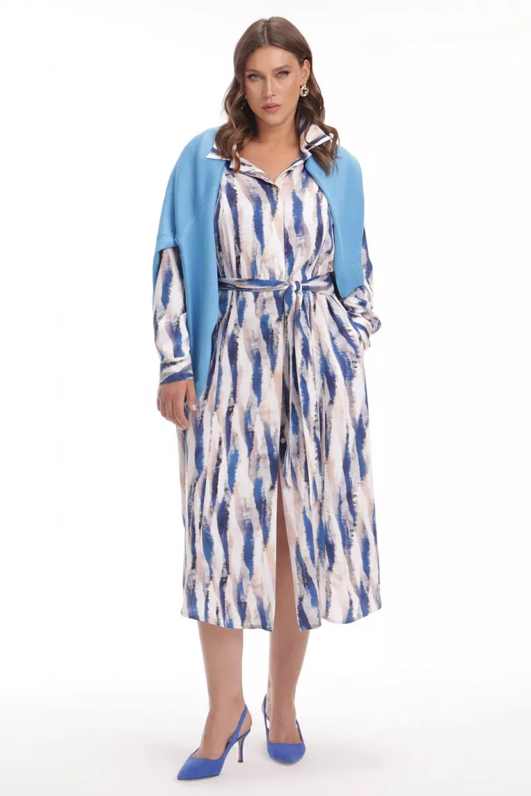Платье-рубашка прямого силуэта, на пуговицах выполнено из вискозы с абстрактным принтом, длина — миди. Воротник стояче-отложной, спереди — скрытая застежка на пуговицах. Рукав длинный, на манжете, пройма широкая. В боковых швах расположены карманы. Платье комплектуется поясом, который можно использовать для акцента на талии.
