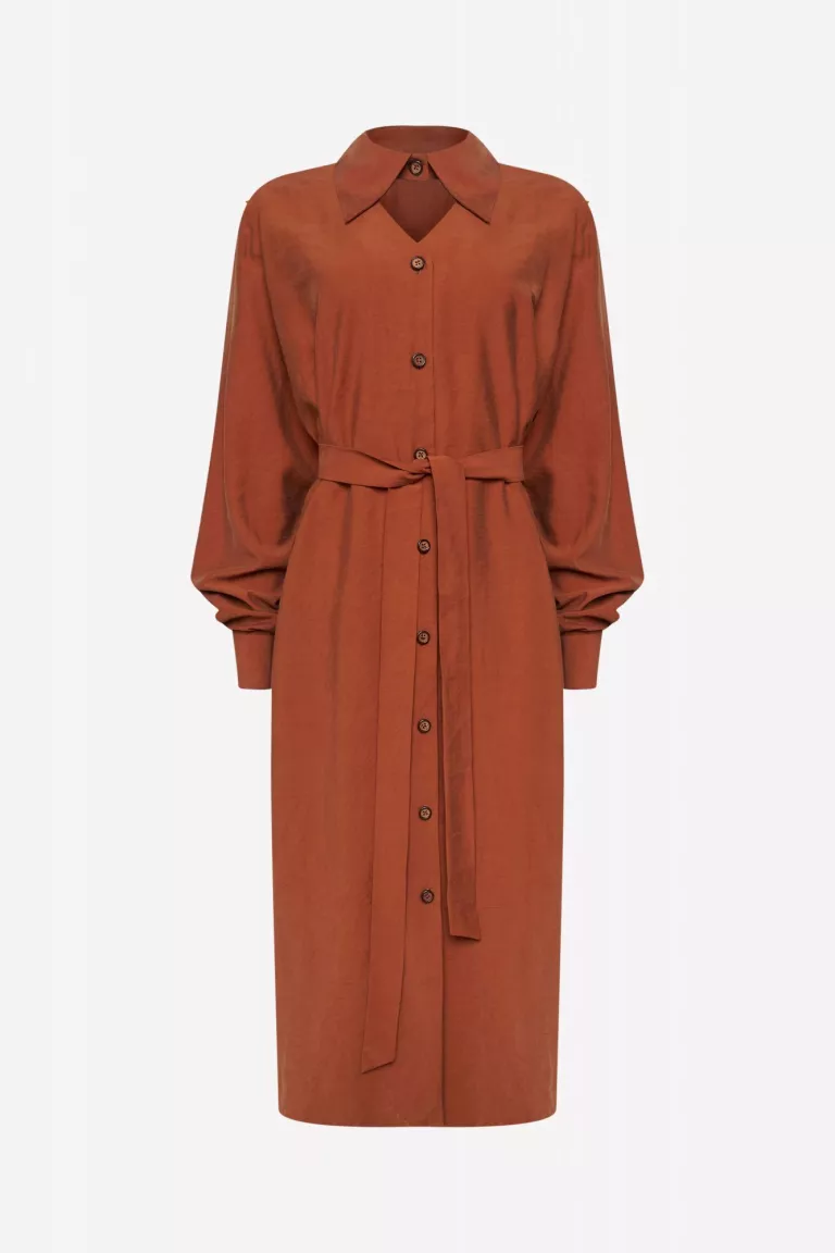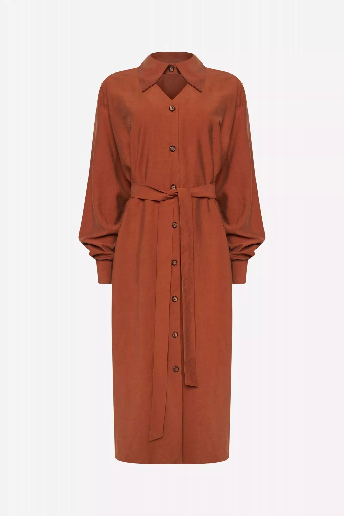 Платье рубашка свободного силуэтного покроя, из модала. Длина миди. Воротник стояче-отложной, с вырезом, спереди застежка пуговицы. Рукав длинный, на манжете, пройма широкая. По бокам разрезы. В комплект входит тканевый пояс.