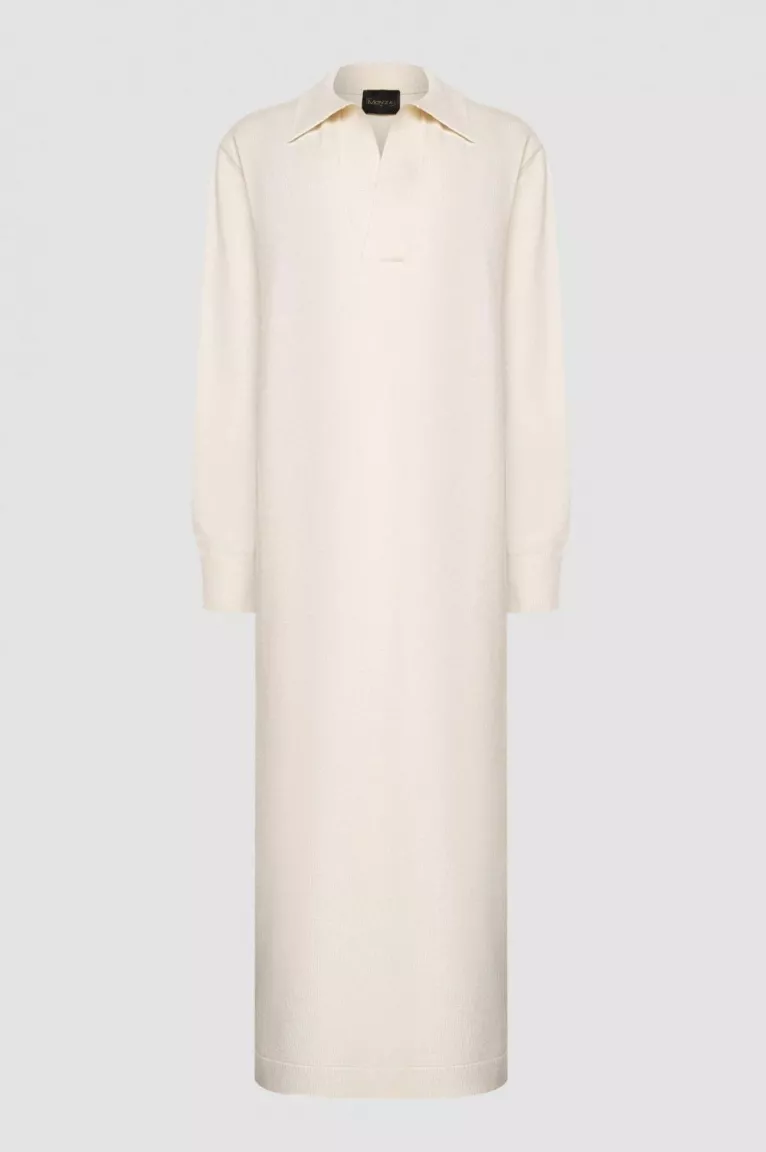 Платье-поло прямого силуэта из смесовой вязаной вискозы, длиной макси, выглядит элегантно и стильно. Воротник отложной, а застежки нет, что подчеркивает лаконичность модели. Длинные рукава и боковые разрезы добавляют платью динамичности и комфорта.