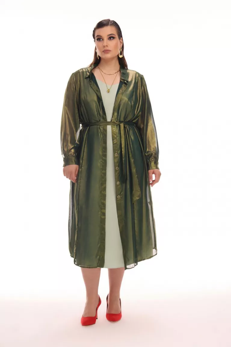 Платье рубашка а- силуэтного покроя, из смесового вискозного шифона с металлизированным блеском. Длина миди. Воротник стояче-отложной, спереди застежка пуговицы. Рукав длинный, на манжете, пройма широкая. В боковых швах карманы.