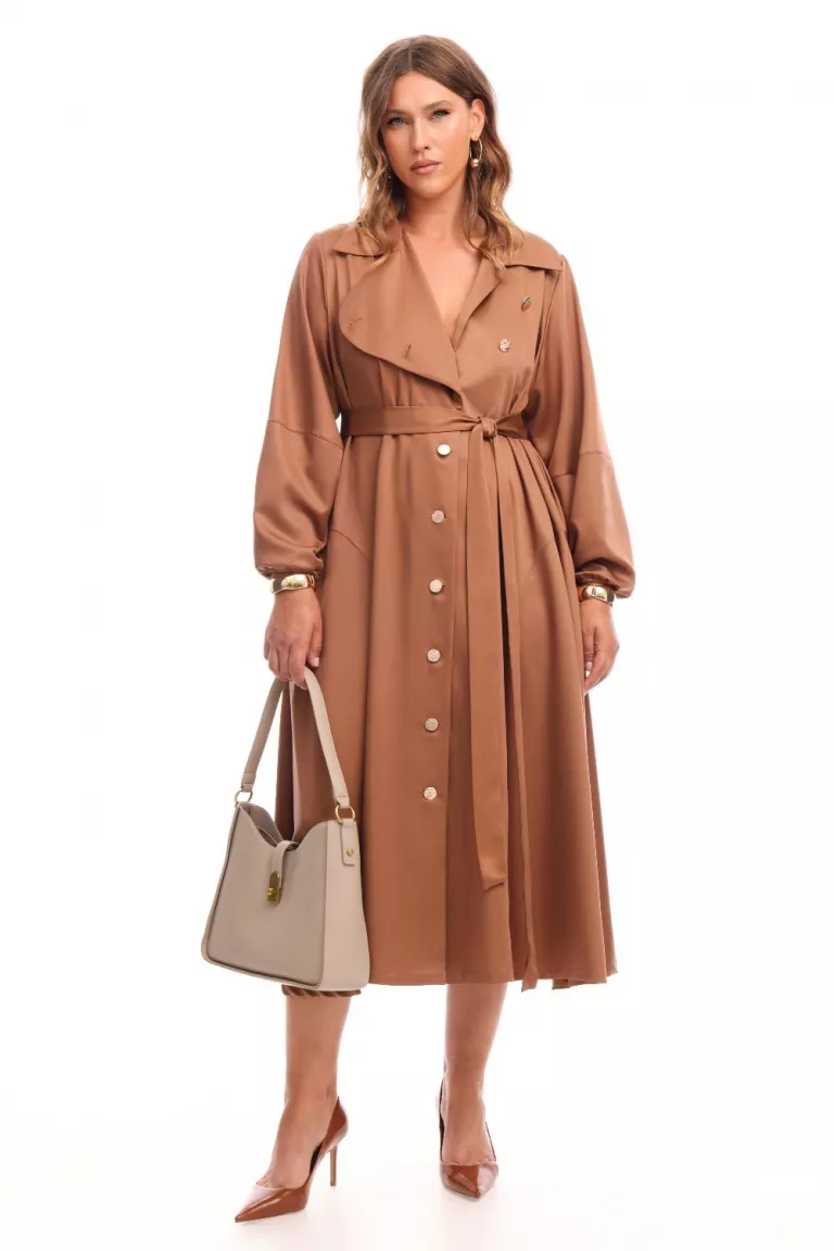 Платье рубашка с расклешенной юбкой, из тенселя. Длина миди. Воротник стояче-отложной, с вырезом, спереди фигурный борт на застежке пуговицы. Рукав длинный, на манжете, пройма широкая.