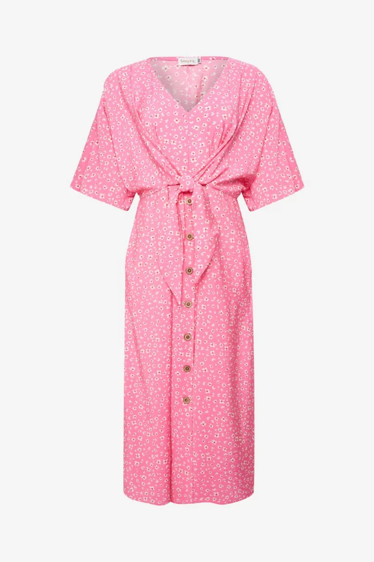 Платье цельнокроеное, из вискозной ткани, с завышенной отрезной линей талии. Длина миди. Спереди V-образный вырез. По низу юбки застежка пуговицы. Рукав спущенный, летучая мышь, пройма широкая. В боковых швах карманы. Декоративный узел.