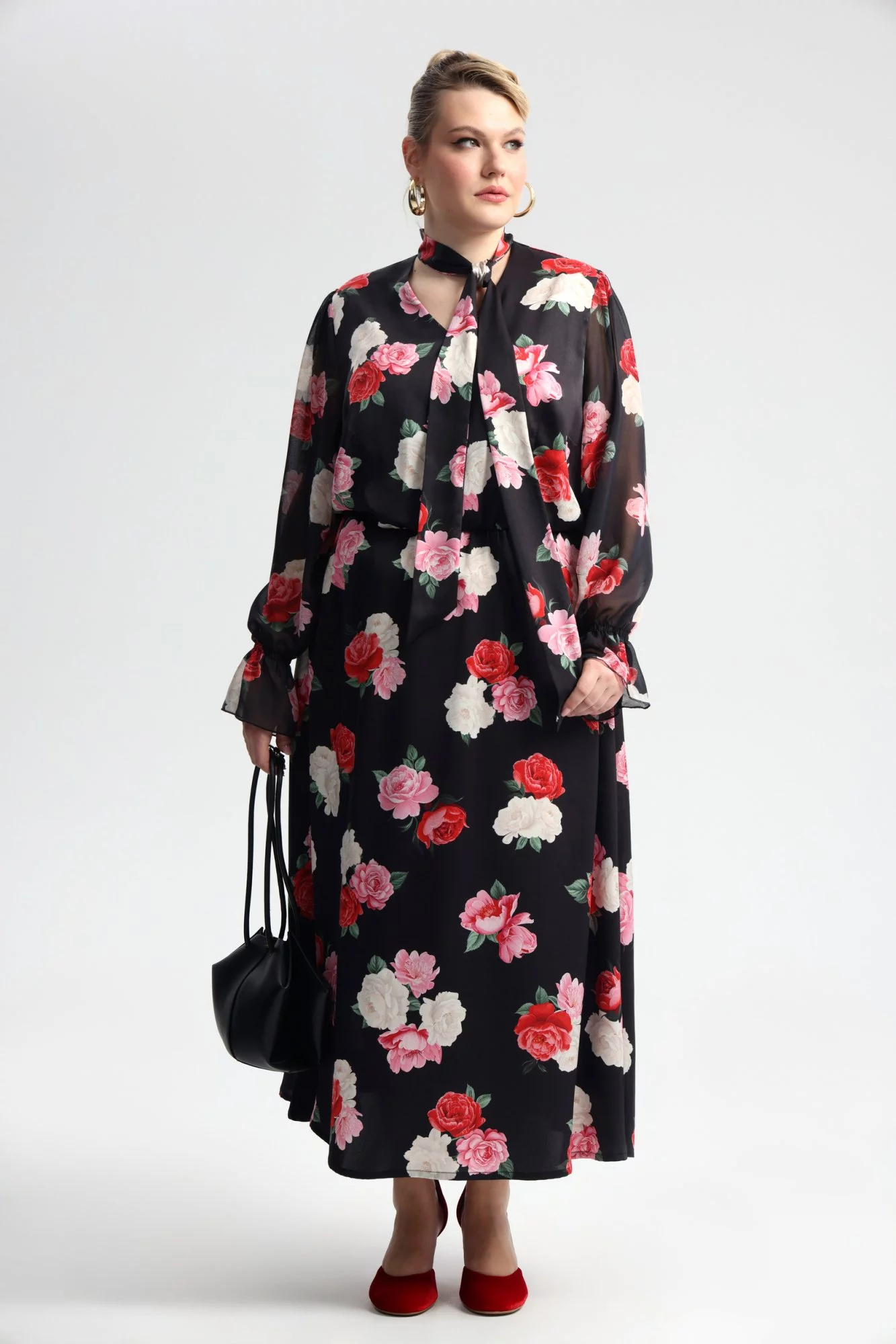Платье отрезное по талии, на внутренней резинке, из поливискозы с принтом, длина миди. Воротник стойка с бантом лавальер. Спереди V-вырез. Длина макси. Рукав длинный, из шифона, на манжете со сборкой, пройма широкая.