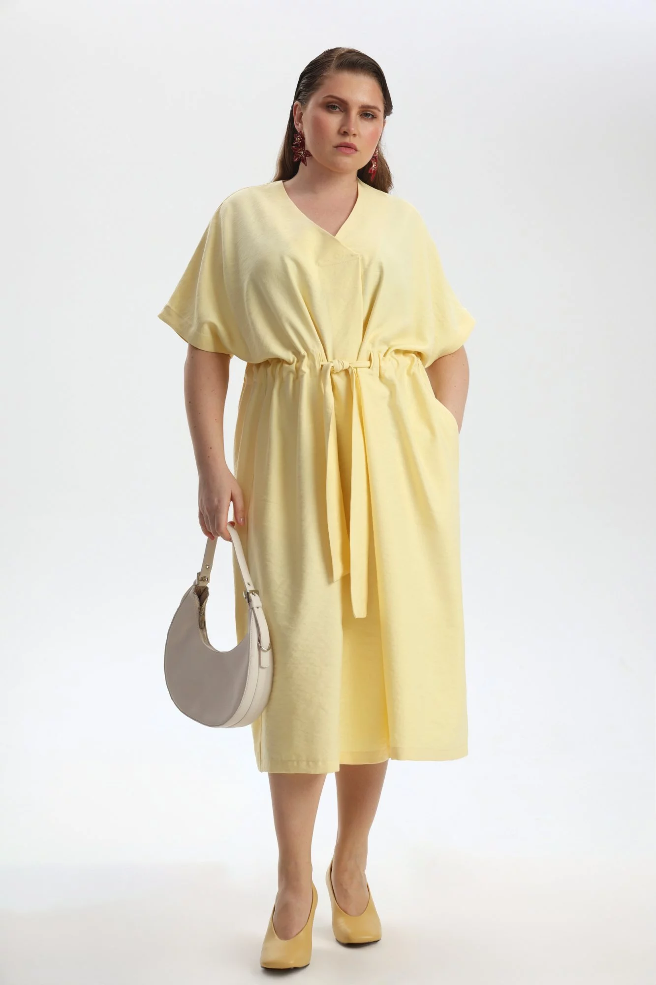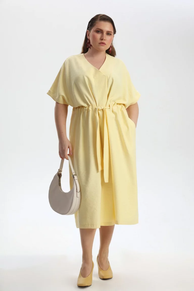 Платье полуприталенного силуэта с V- вырезом, из лиоцелла с добавлением шелка, без подкладки. Длина миди, что придает ему элегантный и утонченный вид. Цельнокроеный рукав, 3/4, широкая пройма. На талии кулиска с поясом.