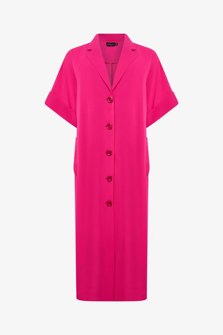 Платье оверсайз прямого силуэта, цельнокроеный рукав, короткий, из смесовой вискозы, без подкладки, застежка пуговицы. Длина миди. Воротник английский, с лацканами. Спереди внутренние карманы. Пройма углубленная.