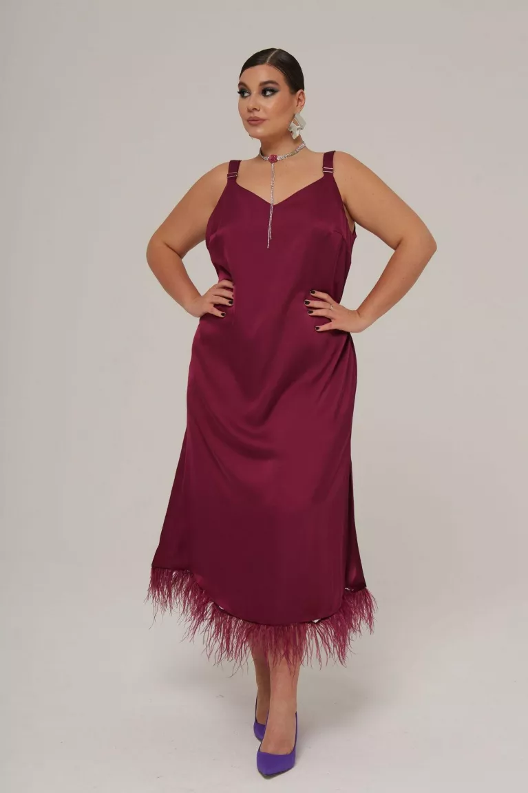 Платье-слип в стиле слинки А- силуэта на широких лямках, из смесовой вискозы. Подкладки нет. Длина миди. Горловина "V"-образная. Пройма широкая. Сбоку разрез. По низу съемная двойная отделка перьями страуса.