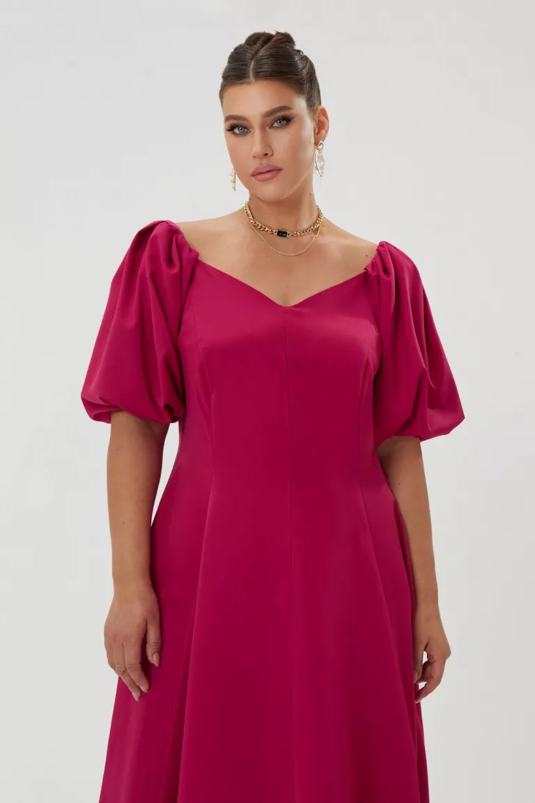 Платье приталенного силуэтного покроя, из смесовой вискозы, длина миди. Горловина лодочка с V- вырезом в зоне декольте. Отрезное с рельефами и расклешенной юбкой. Рукав реглан, фонарик-баллон, 3/4, на подкладке, пройма углубленная.