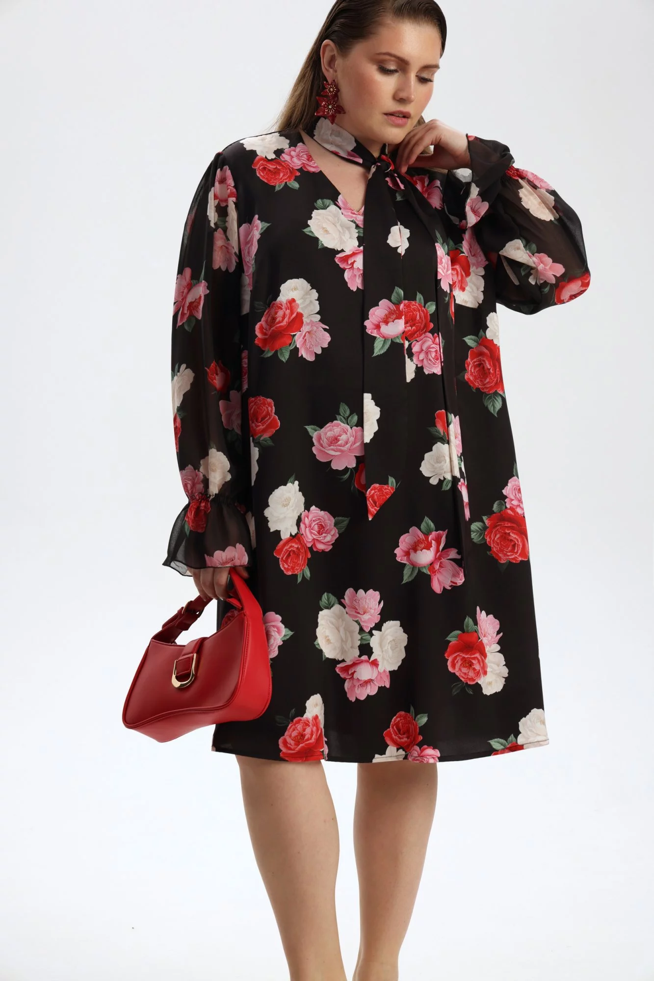 Платье трапеция, из поливискозы с принтом, длина на рост 162 см. Воротник стойка с бантом лавальер. Спереди V-вырез. Длина миди. Рукав длинный, из шифона, на манжете со сборкой, пройма широкая.