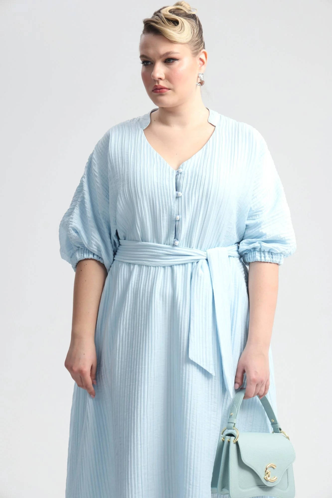 Платье двуслойное, из жатой ткани, на поливискозной подкладке, длина миди. Горловина «V»-образная с воротником стойка, спереди застежка пуговицы. Отрезное по талии, на внутренней резинке, с расклешенной юбкой. Рукав цельнокроеный, фонарик, 3/4, на манжете, пройма углубленная. Комплектуется поясом.