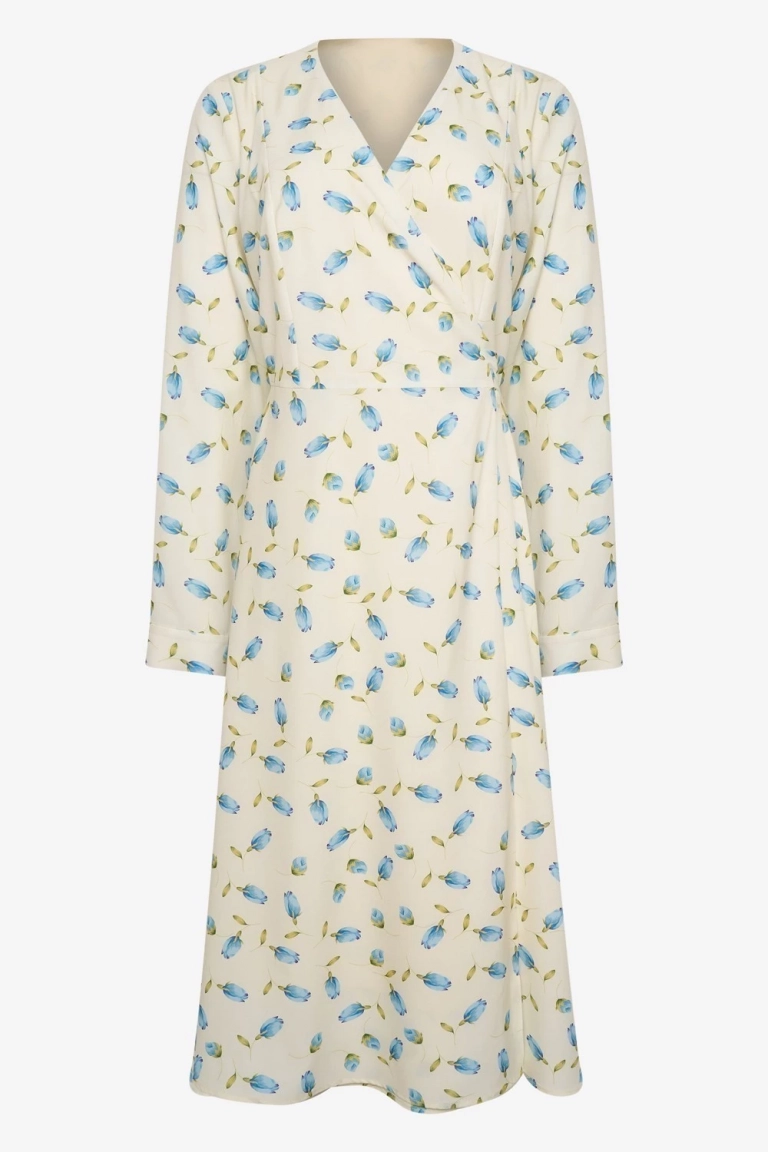 Платье на подкладке, из смесовой вискозы с фактурой шелка. Длина миди. Горловина "V"-образная. Платье с запа́хом, на внутреннем поясе и драпировке. Отрезное по линии талии со слегка расклешенной юбкой. Рукав длинный, на манжете. Платье декорировано принтом.