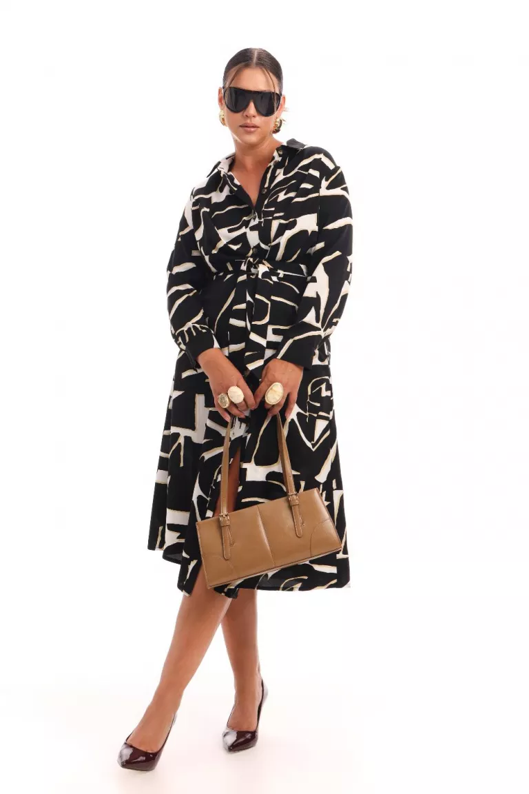 Платье рубашка из смесовой вискозы с принтом пуччи, с отложным воротником, на пуговицах, длиной миди. Спереди конструктивные боковые рельефы с завязками. Рукав длинный, пройма углубленная. Отрезное по талии, с расклешенной юбкой.