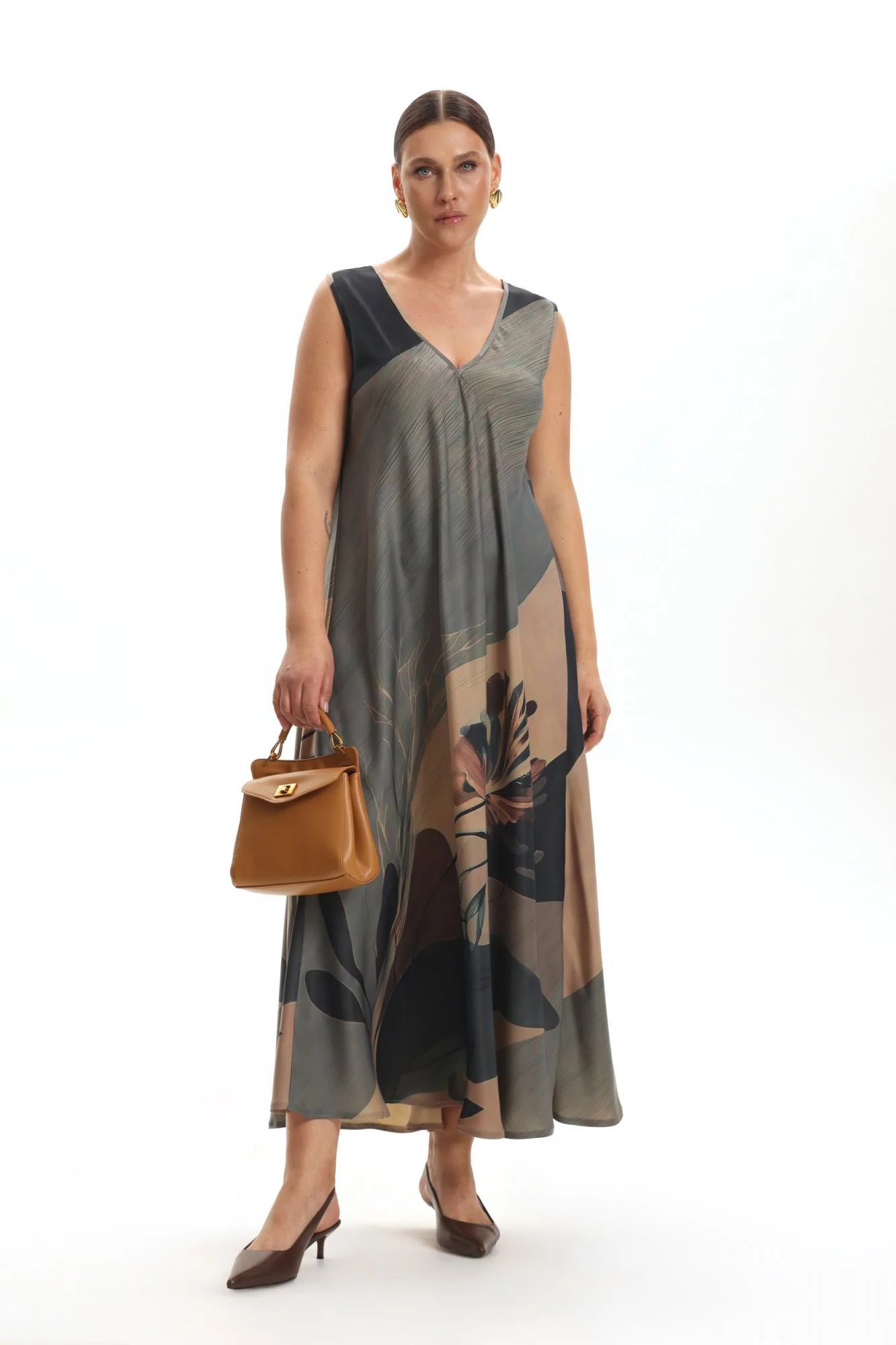 Платье сарафан из поливискозы А-силуэта, без подкладки. Длина макси. Горловина V- вырез. Пройма широкая, рукавов нет.