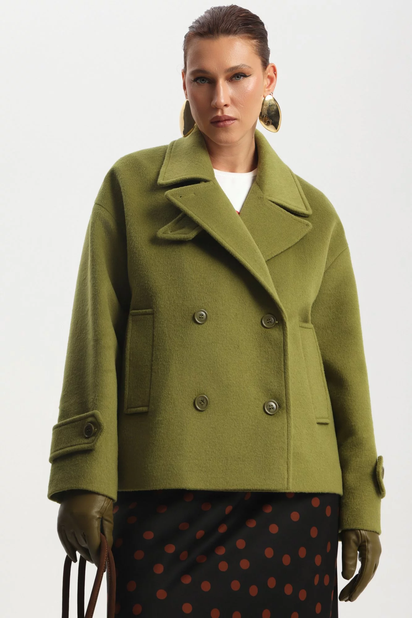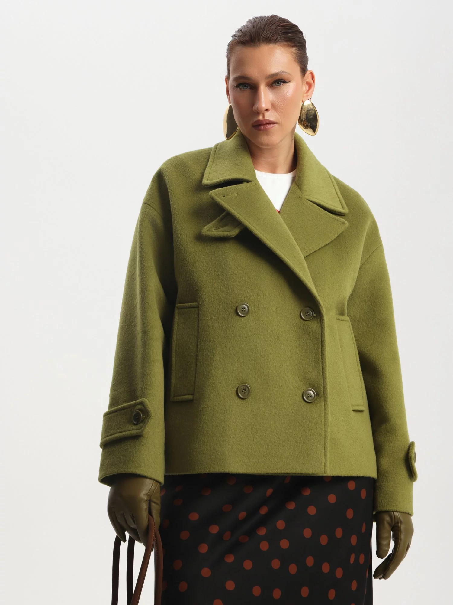 Полупальто двубортное, с высоким содержанием шерсти, на подкладке. Длина миди. Воротник отложной. Рукав длинный, пройма широкая. Спереди прорезные карманы.