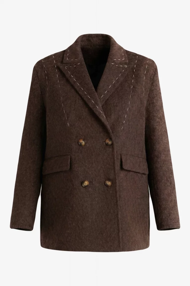 Полупальто жакет двубортное, дабл фэйс, из шерсти ламы, без подкладки. Длина миди. Воротник с лацканами. Рукав длинный, пройма широкая, на конце разрез. Спереди прорезные карманы. Отделка акцентными строчками. По бокам разрезы.