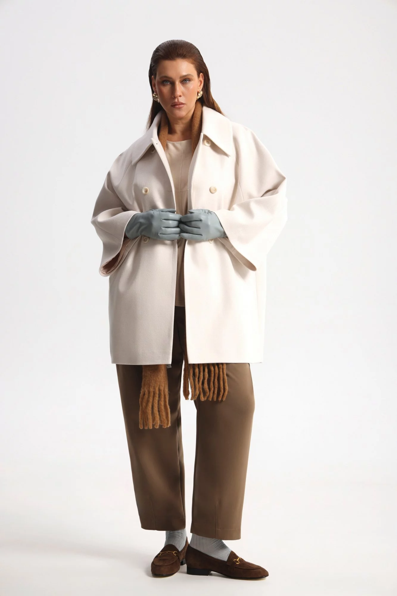 Полупальто двубортное, силуэта пончо, с высоким содержанием шерсти и принтом с принтом хэрингбон (елочка). Спереди застежка на пуговицы и прорезные карманы. Сзади шлица.