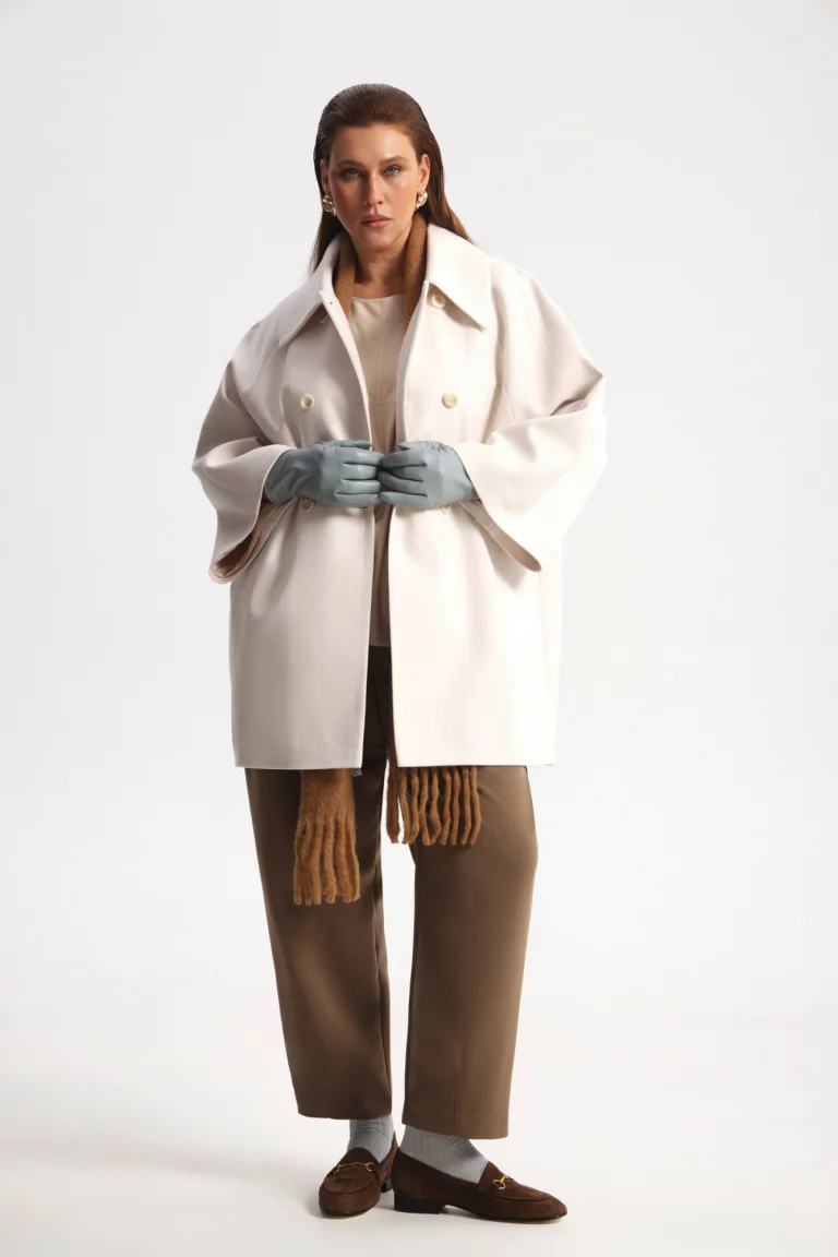 Ткань с узором herringbone узнаваема с первого взгляда: V-образный диагональный рисунок, в котором направления соседних линий зеркально противопоставлены друг другу. «Елочка» выглядит интеллигентно, «дорого» и всегда уместно. Это один из актуальных узоров сезона на подкладке. Длина миди. Воротник отложной. Рукав реглан, 3/4, широкий, пройма летучая мышь. Спереди прорезные карманы в рельефах.