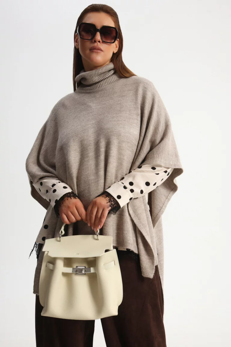 Пончо манишка цельнокроеное, из поливискозного трикотажа. Длина до середины бедра, разноуровневая. Горловина гольф. Рукавов и боковых швов нет.