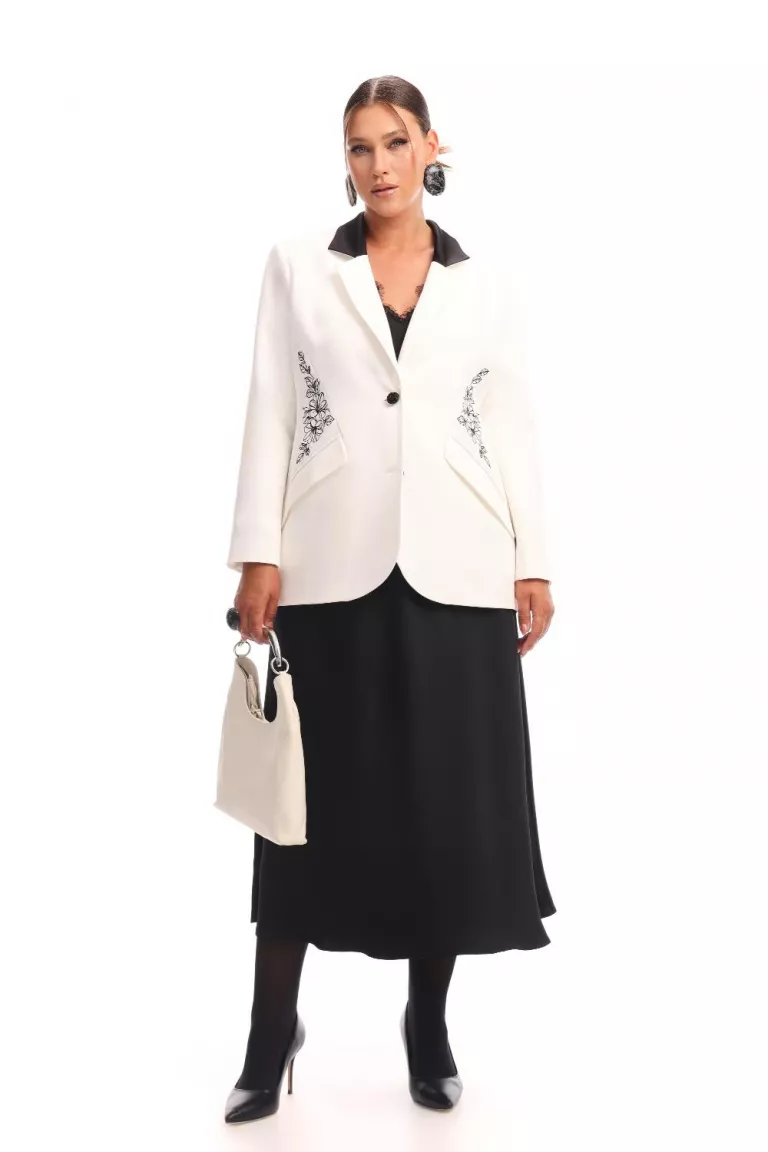 Однобортный жакет полуприлегающего силуэта, на подкладке и пуговицах. Длина миди. Воротник английский, с акцентными лацканами. На спинке рельефы, центральный шов и шлица. Спереди вертикальные вытачки и внутренние карманы. Рукав длинный, с выраженной линией плеча, пройма углубленная. В качестве застежки пуговицы. Жакет с вышивкой. Тренд вышивки на жакетах стал актуальным в 2025 году. Дизайнеры используют различные мотивы и техники, чтобы создать уникальные модели, которые привлекают внимание.